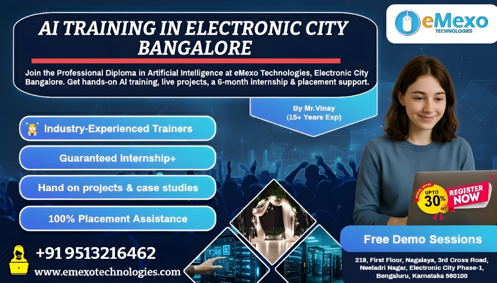 Ai Training In Electronic CityWelcome to eMexo Technologies – Your Gateway to AI Course in Electronic City Bangalore Are you passionate about Artificial Intelligence and ready to shape the future with intelligent systems? eMexo Technologies offers the most comprehensive AI Course in Electronic City Bangalore, designed to help you master real-world AI applications through our AI Training in Electronic City Bangalore. Whether you’re a fresher or an IT professional, our AI Training Institute in Electronic City Bangalore equips you with the skills to thrive in the world of Artificial Intelligence. Why Choose eMexo Technologies for AI Training and Placement in Electronic City Bangalore? At eMexo, we blend expert mentorship with practical experience. Our AI Training and Placement in Electronic City Bangalore bring deep industry knowledge, helping you understand complex concepts in Machine Learning and Deep Learning in Electronic City Bangalore through live projects and case studies. Comprehensive Curriculum –AI Training Center in Electronic City Bangalore & More Our curriculum is carefully designed to cover essential topics such as AI Training Center in Electronic City Bangalore, Neural Networks, Computer Vision, and Natural Language Processing (NLP). Each module includes hands-on labs to help you apply your learning effectively and confidently. AI Certification & AI Career Opportunities in Electronic City Bangalore By completing our AI Certification Course in Electronic City Bangalore, you’ll gain a globally recognized credential that validates your expertise. This opens doors to exciting Best AI Training in Electronic City Bangalore like AI Engineer, Data Scientist, and Machine Learning Developer. We also offer placement support and interview preparation to help you achieve your dream job. Join the Best AI Training Institute in Electronic City Bangalore Today! Take the next step in your tech career with eMexo Technologies. Learn from industry experts, build AI-driven projects, and earn your Best AI Training in Electronic City Bangalore to stand out in today’s job market. Contact: +91 9513216462 | Email: info@emexotechnologies.com Location: eMexo Technologies, Electronic City, Bangalore Visit Us: https://www.emexotechnologies.com/courses/artificial-intelligence-certification-training-course/