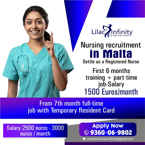 Lilac International Nursing Placement Program In Malta"Malta is emerging as one of the most attractive, realistic options for internationally trained nurses and the name Malta stems from the Greek word meaning “place of honey,” lives up to its charming title in more ways than one. A trip to Malta is a journey into a land where nature, culture, and career opportunities intertwine seamlessly.For nursing professionals, Lilac International Nursing Recruitment program to Malta offers a unique and rewarding pathway to work as a registered nurse through its structured Healthcare Placement Programs in Malta. Lilac International is a trained leading Overseas Education Admission Office that also offers a wide range of Diploma programs for skilled workers who want to secure jobs in Malta with attractive salaries and strong career growth in diverse fields, including healthcare, hospitality, IT, and more. For nurses looking to advance their careers, Malta provides an excellent opportunity through the Lilac International Nursing Placement Program, which is specifically designed for skilled nurses who wish to work and settle in Malta as registered nurses. Through our Nursing Placement Program in Malta, students can also explore job opportunities across 27 Schengen countries in Europe. With a smooth visa process and guidance from our young expert counsellors, students receive step-by-step guidance from selecting the right program to completing applications and settling in Malta, ensuring a seamless transition to successful international career opportunities. Nursing Placement Program in Malta welcomes nurses up to the age of 35, with processing completed within just 3 months and a direct pathway to settle as a registered nurse. Lilac International Coimbatore offers an ideal pathway for young professionals and skilled nurses seeking international exposure and you gain access to a world-class Nursing Placement Program, and a clear pathway to permanent residency in Europe.visit website: https://lilacinternational.co.in/ Instagram: https://www.instagram.com/lilacinternational18/ Youtube: https://www.youtube.com/@LilacInternational Facebook: https://www.facebook.com/Lilacinternationalflywithus/ Contact us: 8807655700"