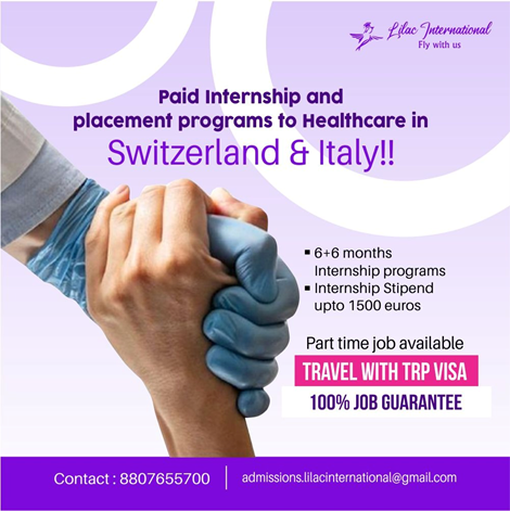 Lilac Infinity Offer Paid Internship And Placement To Healthcare In Switzerland & ItalyThinking about a healthcare career abroad? Lilac Infinity Kollam invites you to join our exclusive, paid healthcare internship program in the Switzerland & Italy Healthcare Sector! Our Healthcare Placement Program, designed for medical and nursing students, offers paid internships, guaranteed job placement, and part-time work opportunities.During your internship,gain hands-on clinical experience and receive an stipend of up to €1500 through this nursing adaptation program of Lilac Infinity. Why Switzerland? One of Europe’s most peaceful countries is Switzerland, a place where nature and modern life exist in perfect harmony and surrounded by the majestic Alps and blue lakes. Switzerland is known for its safety, discipline, and high standard of living. About Italy: Italy is a beautiful country in Southern Europe, known for its rich history and art. At Lilac Infinity, we encourage students to explore Italy as both a travel destination and a place for learning, cultural exchange, and personal growth. Where the majestic Alps touch the sky and innovation meets compassion, Lilac Infinity offers a job opportunity for aspiring healthcare professionals through the Paid Internship and Placement program to Switzerland & Italy Healthcare. Why Lilac Infinity Stands Out for Swiss Healthcare Internships: Earn While You Learn: Secure a paid internship in the top Swiss medical healthcare system by earning a monthly stipend. Part-Time Job Opportunity: Work flexible hours, you get valuable experience, extra income, and the satisfaction of managing your life independently in Switzerland. Travel and Tourism: Your journey begins with a Temporary Residence Permit through the Lilac Infinity Healthcare placement program. We guide you toward Permanent Residency and explore 27 Schengen countries. Cultural Integration: Switzerland is known for its multilingual communities, which create a vibrant environment that enhances communication skills and cultural intelligence. Lilac Infinity is trained leading overseas admission office to guide your journey from student to healthcare professional. Aspiring individuals toward international success through an expertly structured Healthcare Placement Program, real-time placements, and affordable. Our young expert counsellors assist your visa approval success from documentation to the interview. Lilac Infinity helps you obtain your TRP and Work Permit with 100% job Placement, which leads to living and working in European countries. "Lilac Infinity website: https://lilacinfinity.com/ https://lilacinfinity.com/contact-us Instagram: https://www.instagram.com/lilac_infinity24/ YouTube: https://www.youtube.com/@LilacInfinity-j5c LinkedIn: https://www.linkedin.com/in/shamila-infinity-5a417935a/ Twitter: https://x.com/InfinitySh99983 Contact us: 9360069802 "