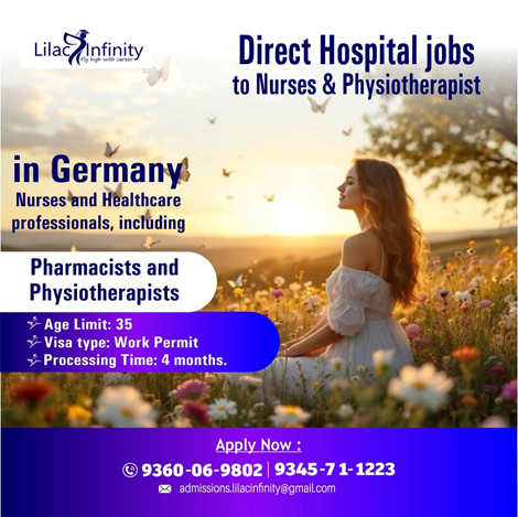 "Germany has emerged as a leading destination for international migrants. International nurses can now enter the German healthcare system, and Germany is actively recruiting nurses and healthcare professionals, including Physiotherapists. A key requirement for enrollment in this program is German language proficiency at the B1 level. This ensures that registered nurses can communicate effectively with patients, colleagues, and doctors, supporting safe patient care in the German healthcare system. Our specialized course equips qualified nurses, pharmacists, and physiotherapists to transition smoothly into German hospital placement. Through Lilac Infinity, expertly curated German placement programs provide real-time medical practice and modern equipment-based clinical practice. The smooth visa process and the availability of a work permit within 4 months make it easier to fly abroad and begin your migration journey. Eventually, healthcare professionals in Germany can secure permanent residency, allowing them to reunite with their family. Contact Lilac Infinity Kollam today, our young expert counsellors provide hassle-free guidance.