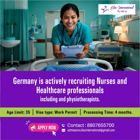 Lilac International Overseas Germany Placement ProgramGermany, Europe’s largest economy, is facing a growing labour shortage in its healthcare sector. With the proportion of the population aged 65 and above expected to rise from 21% to 29% by 2030 Key Takeaways for Indian Healthcare Professionals: Professions in Demand: Nurses, Pharmacists, Physiotherapists Language Requirement: Minimum B2 level German proficiency Support Programs: Visa applications, accommodation, initial settlement Average Annual Salaries: Rs 40 to 42 lakh (approx. €47,000 to €49,000) Career Advancement: Structured pathways and specialization opportunities Contactus:8807655700 admissions.lilacinternational@gmail.com https://lilacinternational.co.in/ Map location:https://www.google.com/maps/ dmshamila2024@gmail.com