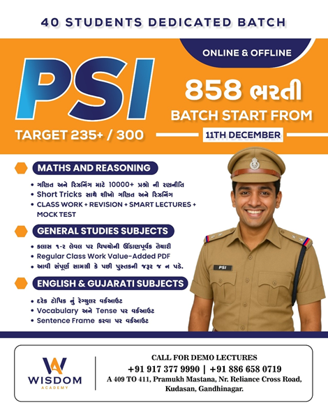 Psi Class In GandhinagarMISSION 2026 ???? ??? ????? ????? ???? ???????? ????? ??? ?????! PSI ?? ??? ??? – 11 ???????? 2025?? ??? ??Target Based Batch - 235+ / 300 ?? Offline Students ?? ??? ????? ?? Online Course ????… ????? Limited Online Batch (Max 25 Students) ?? Personal Mentorship | Pre+Mains | GCERT Focus ?? ???? ??? ??????? ???? ??? ?????? ?? GENERAL STUDIES?? ????? ??? ??? ????? ? ? ???? ?? ?? ??????? ???? ???????? ???????? ??????? ? Regular Topic-Wise Workout ?? Concept Clarity + Daily Practice + Perfect Revision = Sure Success ? Facilities ??PERSONAL MENTORSHIP FOR STUDENT ??SPECIAL FOCUS ON I.Q + E.Q ????????? ?????? ??GCERT ?? ??? ???? ??TASK ?????? ?????? ??CURRENT AFFAIRS ?? ???????? ???? ?? Dedicated Batch – Only 30 Students ?? Admission Open – Register Now! ? ??? ???? ? - ??? ???????????? ??????? ?????? ?????? ??? ?? ??? ??? ????? ??? ????? ???????????? ???????????? ?????? ??????? ??? ?? ???? ????? ????????? ????? ??? ????.(??.??. ???????????? ???????????? ??????,??????+ ????????????????, ???????????? ?????????? ??????. ???? ????????????????) Visit - https://wisdomacademy.education/ ?? Wisdom Academy App Download ??? ?? 9173779990 | 8866580719 | 8866117487