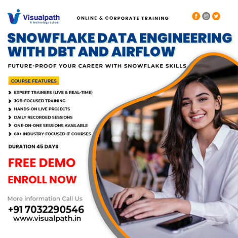 Snowflake Data Engineering Online Training | SnowflakeBoost your data career with Snowflake Data Engineering Online Training at Visualpath. Learn Snowflake architecture, DBT modeling, SQL, and automated pipelines through real-time labs. Our comprehensive Snowflake Data Engineering Course Online prepares you with job-ready, industry-focused skills. Call +91-7032290546 to book your free demo. WhatsApp: https://wa.me/c/917032290546 Visit Blog: https://visualpathblogs.com/category/snowflake/ Visit: https://www.visualpath.in/snowflake-data-engineering-dbt-airflow-training.html