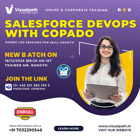 Enroll Now: Salesforce Devops With Copado Online New BatchVisualpath New Salesforce DevOps & Copado Batch helps you master CI/CD automation, Git workflows, and real-time deployments used by modern Salesforce teams. Date:18th December 2025 | Time: 8:30 AM IST Trainer: Mr. Ranjith Join our New Batch Join the Link : https://bit.ly/3Ms0gJc Meeting ID : 455 521 285 1302 Passcode: GR3Ei3mi Call/WhatsApp: +91-7032290546 Visit: https://www.visualpath.in/online-salesforce-devops-training.html WhatsApp: https://wa.me/c/917032290546 Visit Blog:https://visualpathblogs.com/category/salesforce-devops-with-copado/