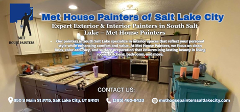 Met House Painters Of Salt Lake CityWelcome to Met House Painters of Salt Lake City, your trusted house painters in Salt Lake City. Specializing in both interior and exterior painting, we bring precision and care to every project. As one of the top painting companies in the area, we pride ourselves on delivering exceptional results that enhance the beauty of your home. Whether you're refreshing a single room or transforming your entire exterior, our skilled team ensures a flawless finish every time. Choose Met House Painters of Salt Lake City for quality craftsmanship and outstanding customer service. Contact us today to schedule your consultation and see why we're the preferred choice for discerning homeowners. Address: 650 S Main St, Salt Lake City, UT 84101, United States Phone Number: +1 385-462-6433 Business Hours: Monday: 8:00am-8:00pm Tuesday: 8:00am-8:00pm Wednesday: 8:00am-8:00pm Thursday: 8:00am-8:00pm Friday: 8:00am-8:00pm Saturday: 8:00am-8:00pm Sunday: 8:00am-8:00pm Services: Painting Contractor Payment Methods: Check, Credit Cards, Debit Cards, Visa, ATM / Debit, Mastercard, AMEX, Paypal, Discover Keywords: House Painters, Painters, painting companies, interior painting companies, home painting companies, home painting contractors, building painters, interior painting, exterior painters, commercial painting, outdoor painters