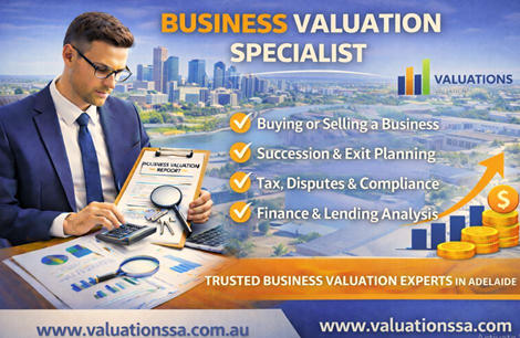 Business Valuation Specialist In Adelaide | Trusted Valuation ExpertsLooking for an experienced business valuation specialist in Adelaide? Valuations SA** provides professional, independent, and accurate business valuation services to support confident financial and strategic decisions. Our qualified business valuation specialists assist with: ? Buying or selling a business ? Business succession & exit planning ? Taxation, capital gains & compliance ? Family law, disputes & legal matters ? Finance, lending & investment analysis At Valuations SA, we use industry-recognised valuation methodologies, in-depth market analysis, and local Adelaide expertise to deliver clear, defensible, and compliant valuation reports tailored to your business needs.
