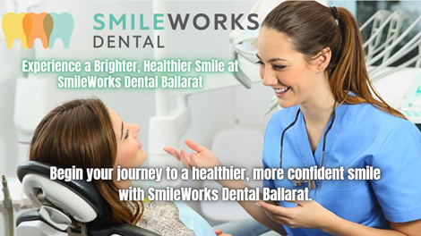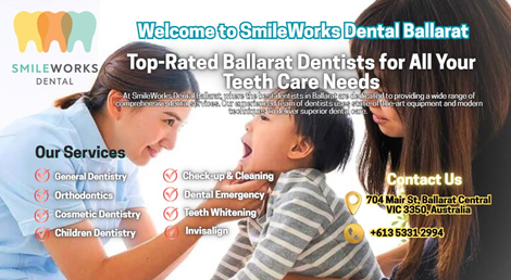 Smileworks Dental BallaratSmileWorks Dental Ballarat is a locally trusted dental clinic providing patient-focused dental care for Ballarat Central and nearby areas. As a reliable dentist Ballarat residents turn to for everyday care, the clinic offers general dentistry, preventive services, routine check-ups and cleans, restorative treatments, and family dentistry for adults and children. The dental team uses modern technology and a gentle, friendly approach to support comfort, clear communication, and long-term oral health. Conveniently located on Mair Street, SmileWorks Dental Ballarat welcomes individuals and families seeking a dependable dentist in Ballarat in a calm, professional setting, with appointments available for new and returning patients. Address: 704 Mair St, Ballarat Central VIC 3350, Australia Phone Number: +613 5331 2994 Business Hours: Monday: 9:00am-5:00pm Tuesday: 9:00am-5:00pm Wednesday: 9:00am-5:00pm Thursday: 9:00am-5:00pm Friday: 9:00am-5:00pm Saturday: Closed Sunday: Closed Services: Dentist Specialties: General Dentistry, Cosmetic Dentistry, Orthodontics, Dental Emergency, Invisalign, Braces, Teeth Whitening, Veneers, Dental Implants, Dentures, Dental Crowns & Bridge, Dental Check-Up, Dental Fillings, Children Dentistry, Root Canal Treatment Payment Methods: Check, Credit Cards, Debit Cards, Visa, ATM / Debit, Mastercard, AMEX, Paypal, Discover Keywords: dentist Ballarat, Ballarat dentist, dentist in Ballarat, family dentist Ballarat, Ballarat family dentist, cosmetic dentist Ballarat, cosmetic dentist in Ballarat, dentist near me, dental clinic Ballarat, emergency dentist Ballarat