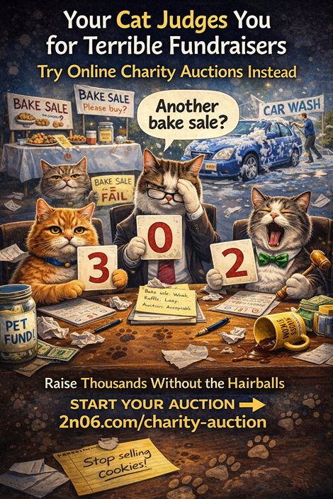 Breaking News: Cats Replace Nonprofit Fundraising CommitteeAnimal lovers understand something important. Dogs are loyal. Cats are judgmental. And if they were in charge of fundraising… they would probably fire bake sales immediately. That’s because traditional fundraisers like: • Bake sales • Car washes • Raffle tickets • Spaghetti dinners often raise very little money while taking a lot of time and effort. Meanwhile, thousands of nonprofits are now raising thousands of dollars in just a few days using a much simpler approach: Online Charity Auctions. Supporters register online, browse auction items, and bid from their phones or computers while supporting your cause. It’s fun. It’s engaging. And it works incredibly well for organizations that care about animals and pets. Animal rescues, shelters, and nonprofit groups across the country are using this system to raise funds for: • Rescue animals • Veterinary care • Shelter improvements • Adoption programs • Wildlife rehabilitation • Service dog programs Best of all: ? No upfront costs ? No complicated event planning ? No financial risk ? Mobile-friendly bidding You also receive: • Your own auction website • A fundraising consultant to guide you • Access to 100+ auction items (vacations, experiences, memorabilia & more) • Proven promotion strategies • Funds delivered within 10 days after your auction closes If your organization loves animals and needs to raise money for your mission, an online charity auction could be a game-changer. Learn how it works here: 2n06.com/charity-auction Reserve a FREE consultation and see how your nonprofit can raise thousands with an online charity auction.