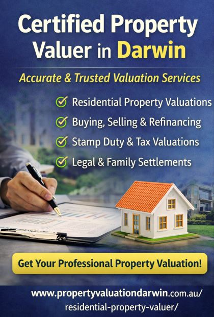 Certified Property Valuer In Darwin – Accurate & Trusted Valuation ServicesLooking for a certified property valuer in Darwin? Get accurate, independent, and professional property valuation services from qualified experts. Whether you need a valuation for buying, selling, refinancing, legal matters, or investment purposes, certified valuers provide detailed reports you can rely on. We specialize in residential property valuations, offering precise assessments based on current market trends and industry standards. Our reports are widely accepted by banks, courts, and government authorities, ensuring complete peace of mind. Key Services: • Residential Property Valuation • Pre-Purchase & Pre-Sale Valuation • Property Market Value Assessment • Stamp Duty & Taxation Valuation • Legal & Family Settlement Valuation Why Choose Us: • Certified & Licensed Property Valuers • Independent and Unbiased Reports • Accurate Market-Based Assessments • Fast Turnaround Time • Affordable & Transparent Pricing