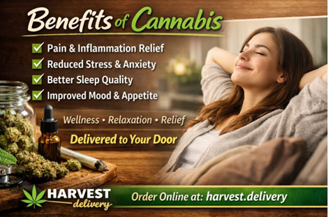 Benefits Of Cannabis – Wellness, Relief & Convenience DeliveredDiscover the benefits of cannabis and how it can support your lifestyle, wellness, and relaxation needs. Whether you’re exploring cannabis for therapeutic use or personal enjoyment, trusted services like Harvest.Delivery make access safe, easy, and convenient. Cannabis has gained widespread recognition for its potential health and wellness benefits when used responsibly and in accordance with local laws. With professional delivery platforms, you can now explore high-quality products from the comfort of your home. Key Benefits of Cannabis • Helps manage chronic pain and inflammation • Supports stress relief and relaxation • May improve sleep quality and insomnia issues • Assists with anxiety and mood balance • Can help stimulate appetite and nausea control Why Choose Online Cannabis Delivery? • Convenient and discreet ordering • Wide selection of quality products • Fast and reliable doorstep delivery • Safe and regulated purchasing experience • Trusted providers with verified products Popular Cannabis Uses • Medical and therapeutic purposes • Recreational relaxation • Sleep support and stress management • Pain and discomfort relief