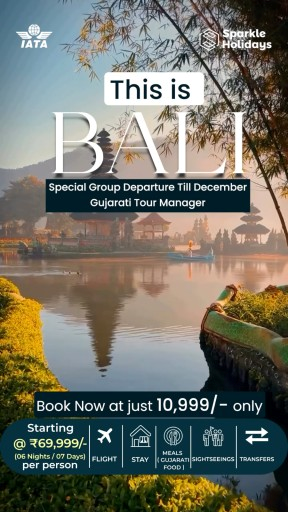 Bali Special Group Departure Till DecemberExplore the beauty of Bali with our special group departure till December. Enjoy a 6 Nights / 7 Days all-inclusive Bali tour package starting from ?69,999 per person. Package includes flights, premium stay, Gujarati meals, sightseeing, and transfers. Travel stress-free with a dedicated Gujarati tour manager for complete comfort. Perfect for families, couples, and group travelers looking for a hassle-free international trip. Book now at just ?10,999 and secure your Bali holiday today.