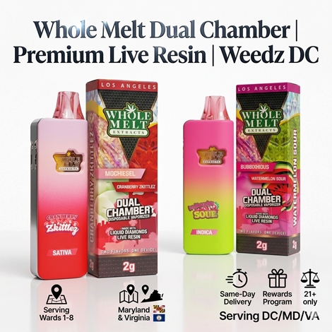 Whole Melt Dual Chamber | Premium Live Resin | Weedz DcExperience the ultimate vaping innovation with the Whole Melt Dual Chamber, now available at Weedz DC. This cutting-edge device offers a premium live resin experience with two distinct flavors in one sleek unit. Perfect for connoisseurs who demand variety and potency. Whether you are at home or on the go, our weed delivery Washington DC service ensures you get your Whole Melts fast and discrete.