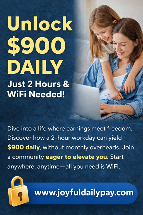 Unlock $900 Daily: Just 2 Hours & Wifi Needed!Dive into a life where earnings meet freedom. Discover how a simple 2-hour workflow can help you generate income online daily—without monthly overheads or complicated setups. Join a growing community ready to elevate you and help you get started step by step. Work from anywhere, anytime—all you need is WiFi. ?? www.joyfuldailypay.com