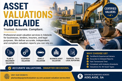 Asset Valuations Adelaide – Certified ExpertsLooking for reliable and professional asset valuations in Adelaide? Our certified valuers provide accurate and independent asset valuation services tailored to your needs. Whether you require valuations for financial reporting, insurance, taxation, or legal purposes, we ensure precise and compliant reports. We specialize in valuing a wide range of assets including plant and machinery, equipment, vehicles, and business assets. With extensive industry experience and in-depth market knowledge, our team delivers trustworthy assessments that help you make informed decisions. Our asset valuation services in Adelaide are ideal for businesses, individuals, and organizations seeking transparency and accuracy. We follow industry standards and proven methodologies to determine the true market value of your assets. Get in touch today for fast, professional, and cost-effective valuation solutions. Key Features: ? Certified & Experienced Valuers ? Accurate & Unbiased Reports ? Fast Turnaround Time ? Compliant with Industry Standards ? Services for All Asset Types