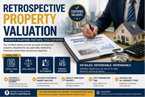 Retrospective Property Valuation – Expert ReportsNeed a reliable retrospective property valuation? Our certified valuers provide accurate and legally compliant property valuations based on a specific past date. Whether for capital gains tax, legal disputes, estate settlements, or financial reporting, we deliver detailed and defensible valuation reports you can trust. With extensive experience and deep knowledge of historical market trends, our valuation experts analyze past sales data, property conditions, and economic factors to determine the true value of your property at a given point in time. We ensure every report meets industry standards and legal requirements. Our retrospective property valuation services are ideal for homeowners, investors, accountants, and legal professionals seeking precise and unbiased assessments. We cover residential, commercial, and investment properties with a focus on accuracy and reliability. Contact us today for professional retrospective valuation services you can depend on. Key Features ? Certified & Experienced Property Valuers ? Accurate Historical Market Analysis ? Legally Compliant Reports ? Fast Turnaround Time ? Suitable for Tax & Legal Purposes
