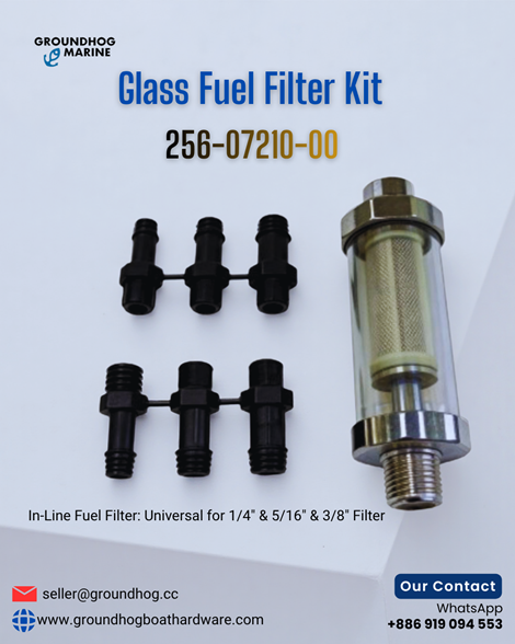 Boat Glass Fuel Filter Kit – Mpn 256-07210-00Boat Glass Fuel Filter Kit – MPN 256-07210-00 | Clear View & Superior Fuel Protection. Protect your engine and monitor fuel quality with the 256-07210-00 Boat Glass Fuel Filter Kit, designed as an in-line universal filter compatible with 1/4", 5/16", and 3/8" fuel lines. The transparent glass housing allows easy inspection of fuel condition, helping you detect contaminants before they reach your engine. Built from durable, marine-grade materials, this filter kit effectively removes dirt, debris, and impurities, ensuring clean fuel flow and optimal engine performance. Its in-line design allows quick installation and easy maintenance, making it a practical solution for a wide range of marine fuel systems. Keep your engine running smoothly and efficiently with a reliable glass fuel filter kit designed for visibility, protection, and long-lasting marine performance. Product Link: https://www.groundhogboathardware.com/buy/main_products.php?pid=5765 Contact us for catalog & price: seller@groundhog.cc +886 919094553 (WhatsApp) https://www.groundhogboathardware.com