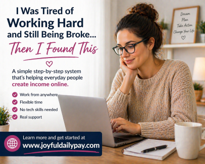 Work From Home Affiliate Income – Beginner Friendly SystemIf you’ve been trying to figure out how to make money online but keep getting stuck, you’re not alone. I was in the same position—no experience, no tech skills, just trying to find something that actually works. I found a simple affiliate-based system that shows how to set up a basic online income stream step by step. This is designed for beginners and can be done from home using your phone or laptop. ? No prior experience needed ? Step-by-step guidance included ? Work at your own pace ? Can be done part-time If you’re serious about starting, you can see how it works here: ?? https://www.joyfuldailypay.com/