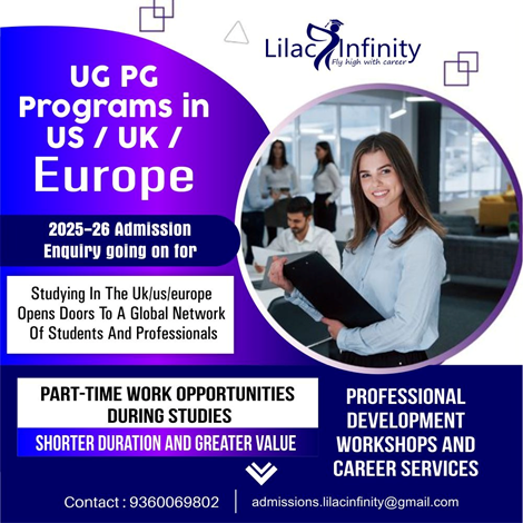 Lilac Infinity Ug & Pg Programs In The Us, Uk, And EuropeLilac Infinity UG & PG Programs in the US, UK, and EuropeIn an age where borders blur and ideas travel faster than ever, choosing to study abroad isn’t just about earning a degree -- step toward global opportunities.One of the biggest reasons students choose to study abroad in countries like the US, UK, and Europe is the blend of world-class education, vibrant cultural immersion, and global career opportunities that propel them toward a limitless future. In an era where technology shapes the future, Lilac Infinity study-abroad-program offer ug-pg-programs in uk-us-europe including specialized courses in emerging fields like Data Science,Business Analytics and Artificial Intelligence (AI), equipping students with the technical expertise for international students equipped with advanced business analytical skills, hands-on experience in machine learning, big data, and AI-driven tools, and a globally relevant perspective.Imagine studying in a continent where every train ride could lead you to a new language, cuisine, or centuries old library.Lilac invites you to explore ug-pg-program and study-abroad programs across us-uk-europe that blend the richness of tradition with the pulse of innovation. These study-abroad-programs aren’t just about earning a degree—they’re about experiencing world-class education in fields like Data Science,Business Analytics and Artificial Intelligence (AI), all while living amidst centuries of cultural heritage.Whether you're aspiring to launch a career as a data scientist, AI specialist, or tech innovator, Lilac Infinity offers comprehensive guidance from choosing the right university and course to navigating the student visa process and preparing for global oppurtunities. Address: Kochaman Nada, Near Meenakshi Amman temple, Kollam, Kerala 691005, Pattathanam, Kollam, Kerala 691021 website: https://www.lilacinfinity.com/ Facebook:https://www.facebook.com/profile.php? Instagram: https://www.instagram.com/lilac_infinity24/