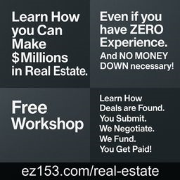 . Make Millions In Real EstateZero experience? No problem. No money down? Perfect. Learn where the deals are, submit them, and get funded. We train you step-by-step. Free workshop.