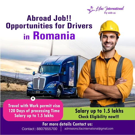 Lilac International Jobs In Romania!! Oppourtunities For Drivers.Jobs in Romania!! Oppourtunities for Drivers. Truck Drivers. Travel with Work permit visa. 120 Days of processing Time. Salary up to 1.5 lakhs. Check Eligibility now!!! For more details Contact us: 8807655700 admissions.lilacinternational@gmail.com