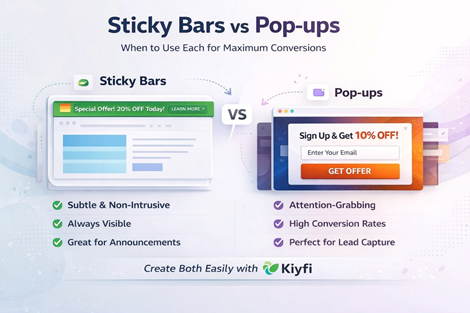 Sticky Bars Vs Pop-Ups: When To Use Each For Maximum ConversionsGetting visitors to a website is only the first step; turning them into subscribers or customers is where the real challenge begins. This blog explains how pop-ups and sticky bars help improve website engagement and conversions by highlighting offers, announcements, and lead capture opportunities at the right moment. It breaks down the key differences between popup vs sticky bar, including how pop-ups grab immediate attention for actions like email signups and discount offers, while sticky bars provide a subtle and continuous way to display promotions or updates without interrupting the browsing experience. The article also explores when to use each element and how combining both can strengthen a website’s conversion strategy. ?? To easily create and test pop-ups and sticky bars without coding, Please Visit: E-mail Id: accounts@kiyfi.com Website: https://kiyfi.com/sticky-bars-vs-pop-ups-when-to-use-each-for-maximum-conversions/