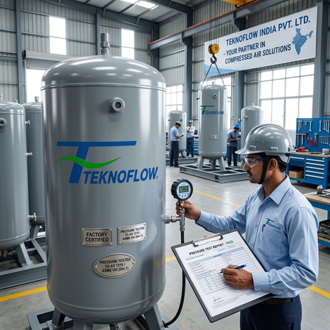 Top Quality Air Compressor Receiver Tanks In India – Pressure Tested, Factory CertifiedLooking for the best air compressor receiver tanks in India? Teknoflow offers pressure-tested, factory-certified solutions including horizontal air compressor tank, 120 gallon air compressor tank, and custom sizes. Every ASME air compressor tank features a built-in pressure relief valve air tank safety system. Our air storage tank for compressor systems ensures zero pressure drops and maximum uptime. Trusted air receiver tank supplier across Mumbai and India.